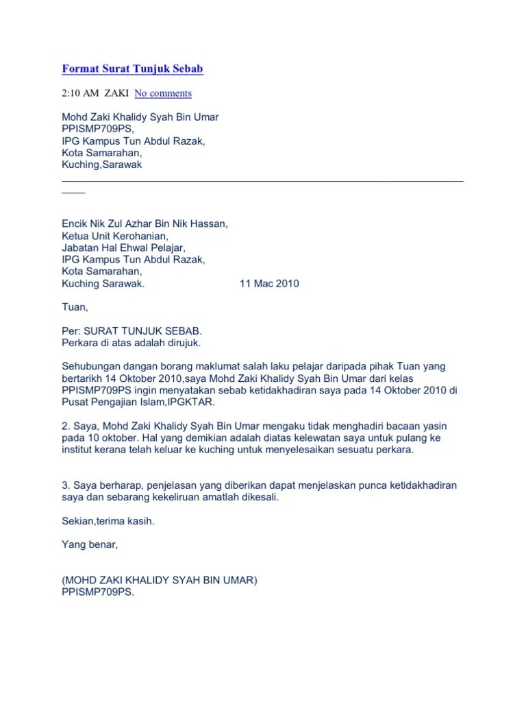 Contoh surat tunjuk sebab lewat datang kerja. We did not find results for: Check spelling or type a new query. Maybe you would like to learn more about one of these?